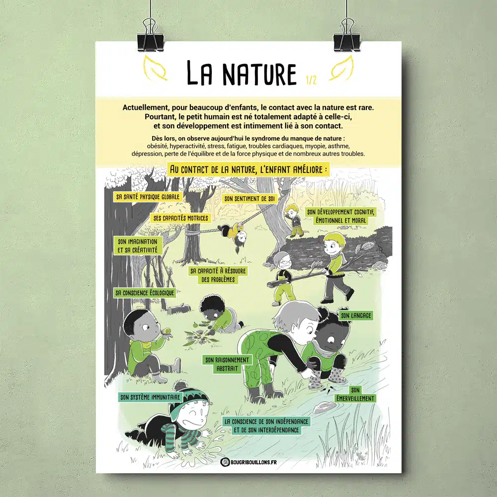 « Cette affiche met en avant le manque de Nature dans la vie des enfants et les bienfaits qu’elle procure dans le développement de l’Enfant, grâce à un texte court, des mots clés et une fresque illustrant plusieurs petites scènes jeu dans la Nature. », d’après Bourgribouillons.